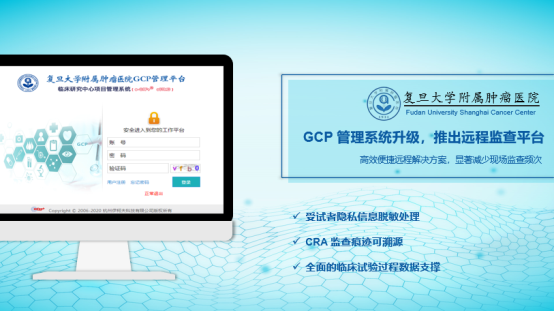 2020年3月27日,“復旦大學附屬腫瘤醫院GCP管理平臺-臨床研究中心項目管理系統(sCTMS)”中的遠程監查平臺(以下簡稱“遠程監查平臺”),經過復旦大學附屬腫瘤醫院藥物臨床試驗機構工作人員、信息科和杭州伊柯夫軟件技術工程師的共同努力,正式進入試運行階段。